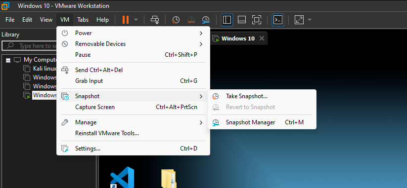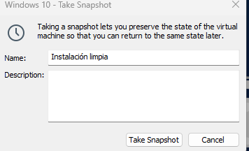 Ahora realizaremos un «snapshot» del estado de la máquina para poder volver a él en caso de algún error o modificación y tener una imagen «limpia» , para ello , (yo lo hice con VMWARE Workstation) nos vamos a VM -> Snapshot -> Take Snapshot