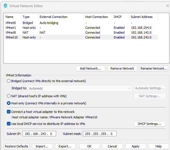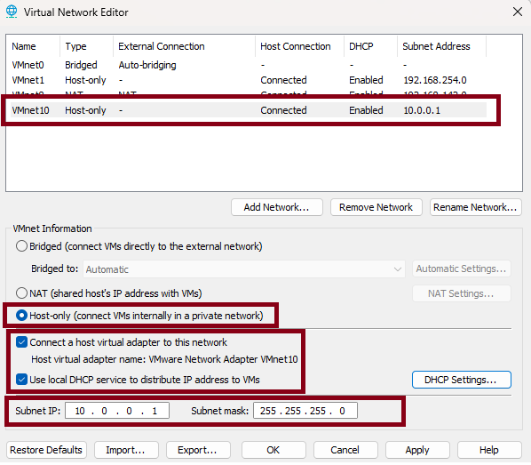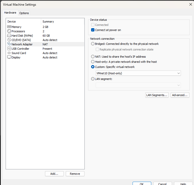 En la configuración de las máquinas , en el apartado de «Network Adapter» seleccionamos la nueva red que hemos creado modo host only (en nuestro caso la vmnet10 por ejemplo)