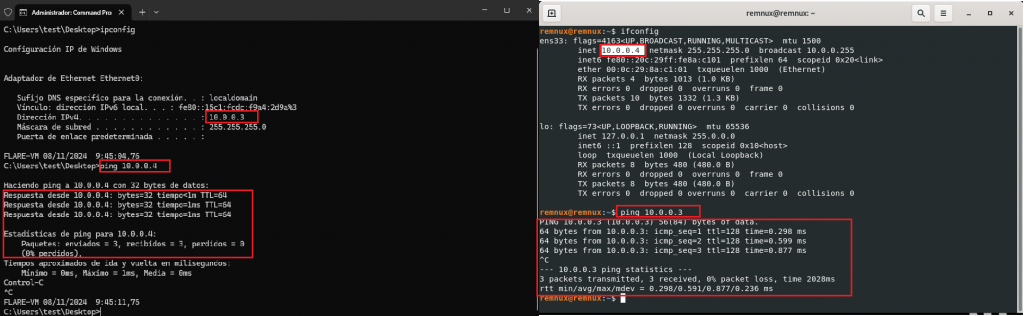 Ambas VM ahora están configuradas en el adaptador de solo host para la comunicación interna. Ahora probaremos la red y las conexiones a Internet con el comando ‘ping’.