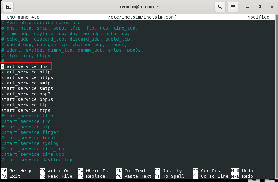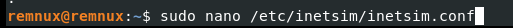 Como vemos , no está el servicio de DNS , el cuál deberíamos habilitar. Para eso, abrimos el archivo inetsim. conf para habilitar el servicio DNS.