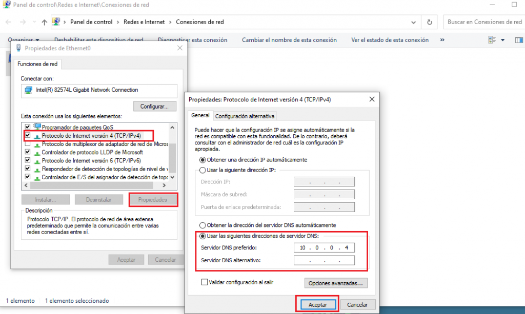 y en propiedades configuramos lo siguiente (la ip de dns que hemos configurado previamente en REMnux):