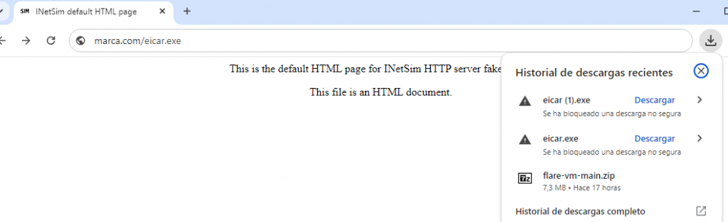 y para descargas por ejemplo añadimos un /eicar.txt y vemos que lo descarga