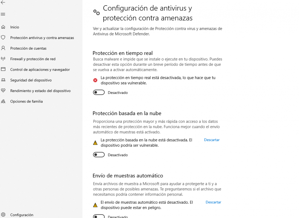Busca «Defender», abre la configuración de Defender y desactiva todas las opciones de Defender.