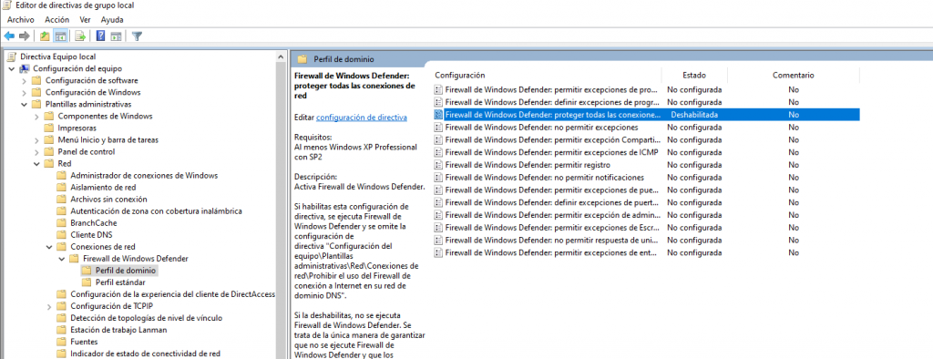 GPO → Plantillas Administrativas → Red → Conexiones de Red → Firewall de Windows Defender → Perfil de Dominio → Desactiva «Proteger todas las conexiones de red».
